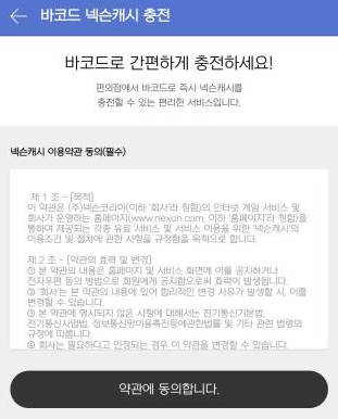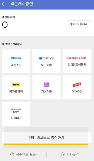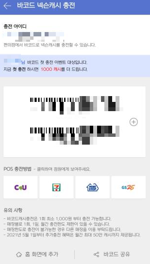 - 바코드 캐시 충전은 한번 충전할 때 1000원부터 충전 가능